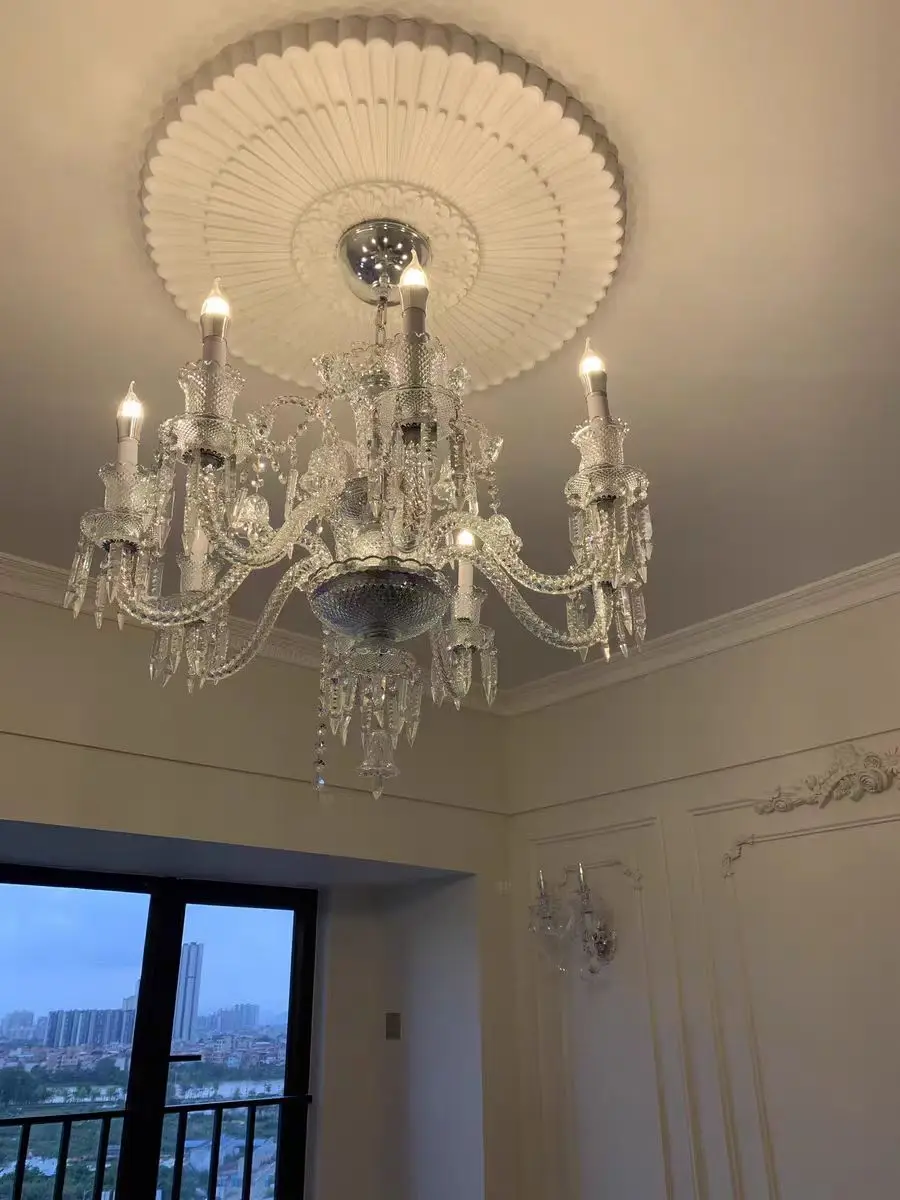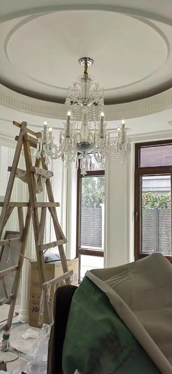The large chandeliers for high ceilings boast a construction of K9 Crystal, Glass, and a chic white fabric lampshade, adding sophistication to any room. The polished chrome finish of the gold and crystal chandelier enhances the aesthetic appeal, making it a striking focal point. Energy-efficient LED bulbs your space and add an eco-friendly touch to your lighting.